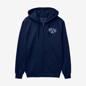 Elevate your wardrobe with the Unisex Spade Full Zip Hoodie in navy. This versatile hoodie features a standout spade graphic on the back, detailed with silver metallic accents. The Hard Rock fashion logo on the left front chest adds a touch of signature style. With it’s adjustable drawstrings for the hood, snug rib knit cuffs…