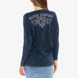 Guitar Company Ladies Fit Tee with Crown Guitar Design in Blue Feel like a true rock star when you wear this stunning crown guitar tee. Velvet neck tape interior collar, with distressed flocking. Featured with an optic wash, contrast side seam stitching, and water based print.