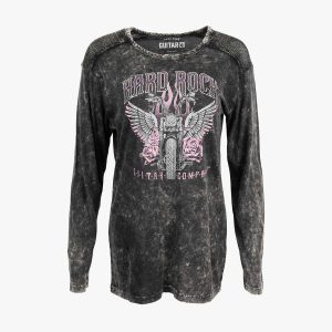Ladies fit Long Sleeve Tee with Bling Motorcycle Design in Black Show your daring side in this motorcycle roses long sleeve tee with a unique wash. Featured with a sweater panel shoulder, to keep you cozy on windy bike rides. Rhinestone on graphics to give the mineral wash a great finish. Elements of pink adorn…