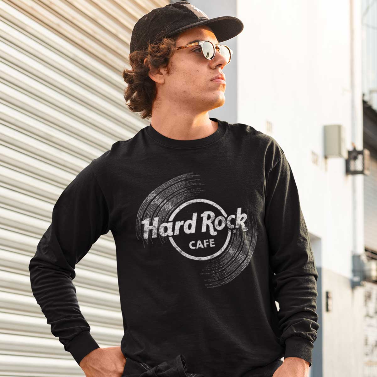 Adult Fit Vinyl Logo Longsleeve in Black Spin right round in our Unisex Fit Hard Rock vinyl logo longsleeve tee. Soft blended fabric, just the right amount of stretch, and a casual fit for every day of the week. Pair it with skinny jeans, and metallic sneakers for an effortless, everyday look!