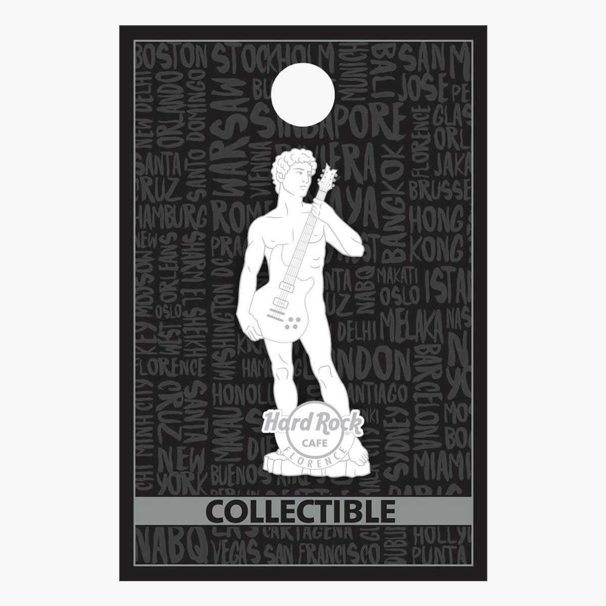 Florence 3D David Pin A new and rocking take on the very famous David statue. Cast in solid white with silver plating and sporting a strategically placed guitar.