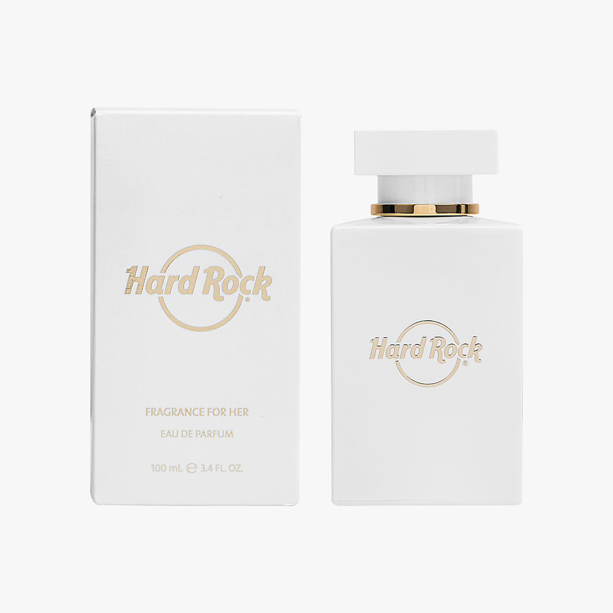 Hard Rock Women’s Fragrance is a warm, floral, and amber scent in a chic lacquered white and gold bottle.