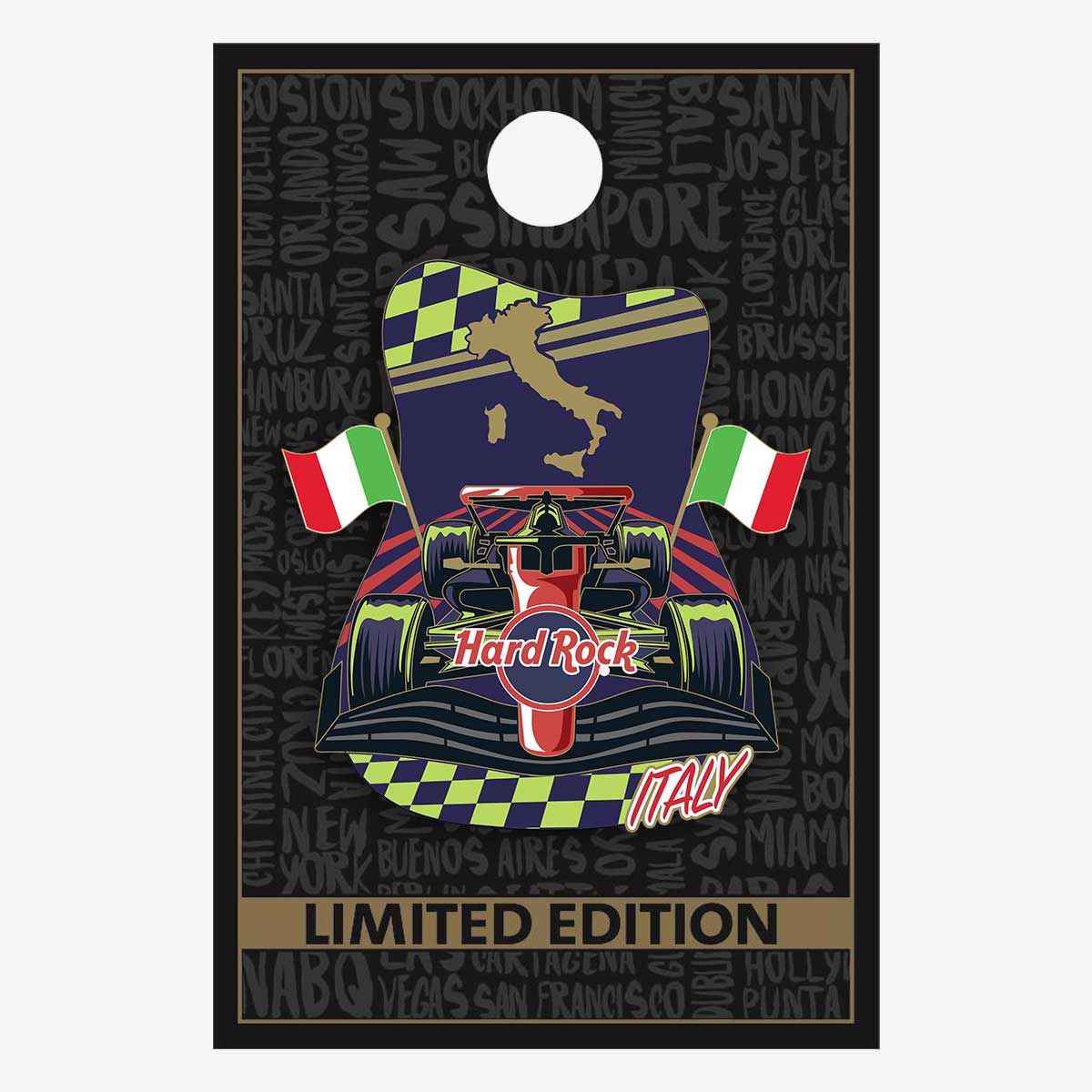 Built for speed and made to impress, the Limited Edition Italy Racing Pin is a full-throttle tribute to motorsport greatness. Shaped like a race car in motion, this design blazes ahead with black and neon checkered accents that roar with momentum. Twin Italian flags flare from the rear as the country’s silhouette takes center position like a champion’s mark. The Hard Rock logo powers across the nose, with “Italy” stamped in bold red beneath it. Every detail brings the spirit of Italian racing to life—fast, fearless, and absolutely next-level.
