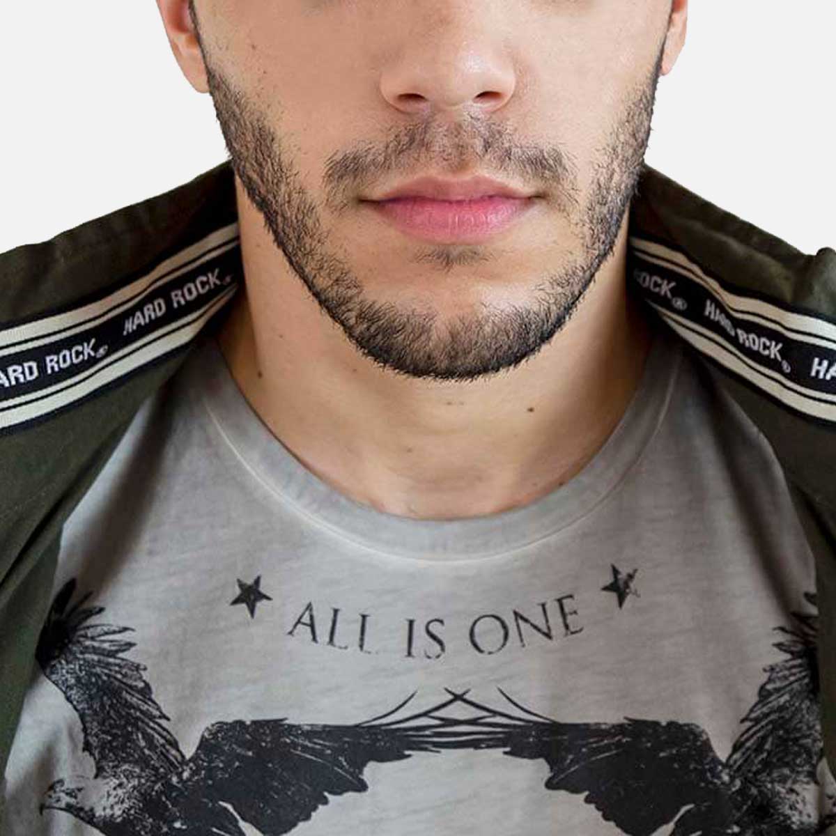 Make the room stand at attention in this versatile, modern-fit army green military inspired jacket – designed exclusively for the Hard Rock. Versatile to wear everywhere and keep you stylish but also warm. Fabric feels like a washed jean cotton material that is soft yet durable to the touch. Add more pins and patches to give it your own look. Finish the look with your favorite pair of vintage denim jeans.