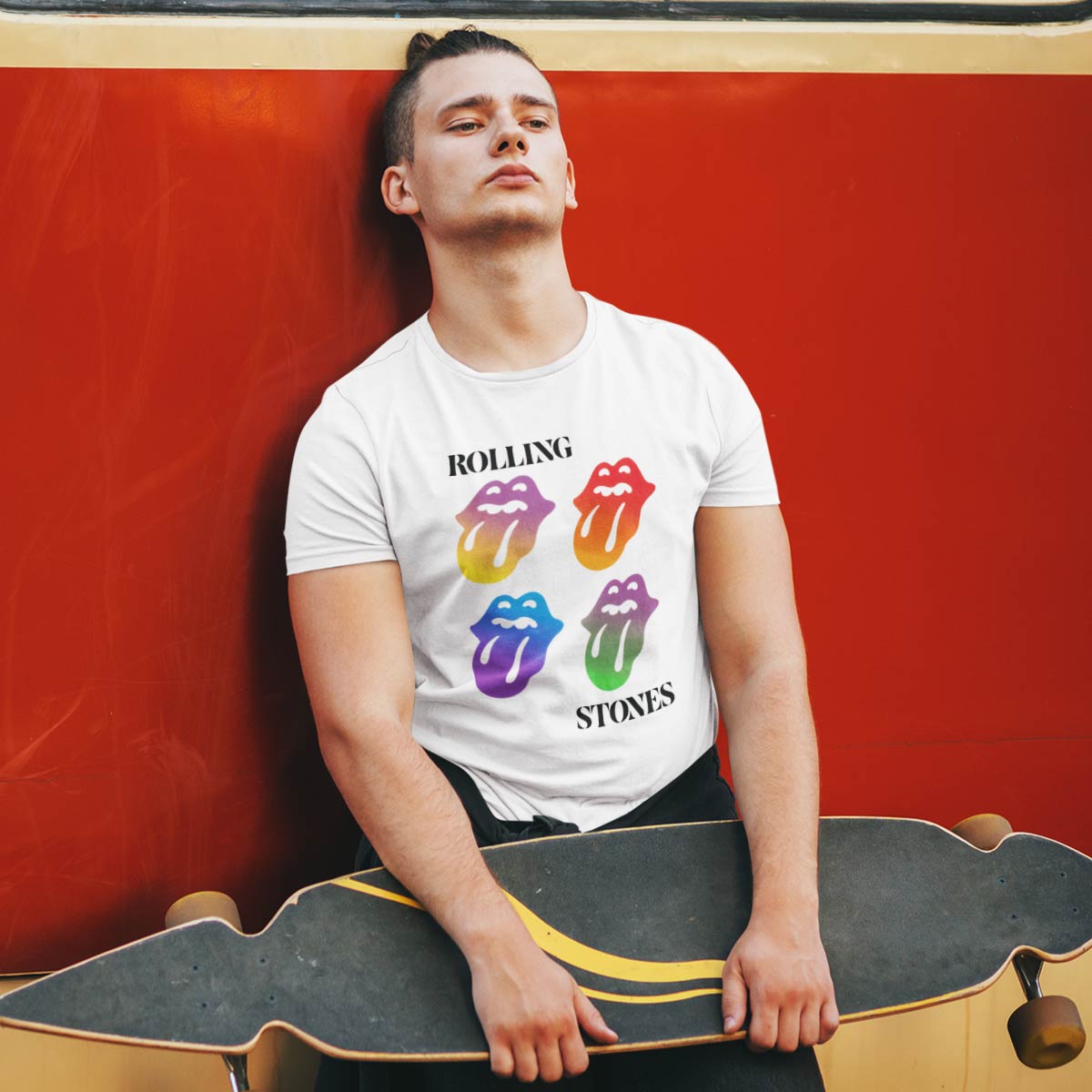 Rolling Stones Shortsleeve T-Shirt in White Celebrate the Rolling Stones sixty year anniversary in style! Meet your favorite shortsleeve band t-shirt by the Rolling Stones, official merchandise for the Hard Rock. Featuring a repeat rainbow print of the iconic tongue and lips logo. The logo was originally crafted by the English art designer John Pasche in 1970. Pair with your favorite vintage denim pants, army jacket and combat boots for an effortless look!ee