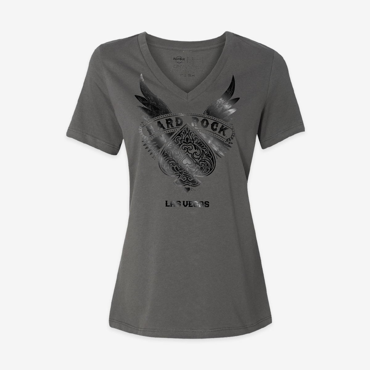 Step into the spotlight with the Ladies’ Spade V Neck tee in gray! This chic top features a bold Las Vegas city drop, a striking graphic of a spade with wings, and “Hard Rock” in sleek black foil. Perfect for adding a touch of glamour to any outfit!